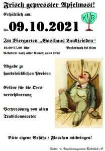 - Gekeltert nach alter Kunst; anno 1925 - Abgabe zu handelsüblichen Preisen - Erlöse für die Ortsverschönerung - Verpressung von alten Traditionssorten PLAKAT: Frisch gepresster Apfelmost Bitte eigene Gefäße / Flaschen mitbringen!